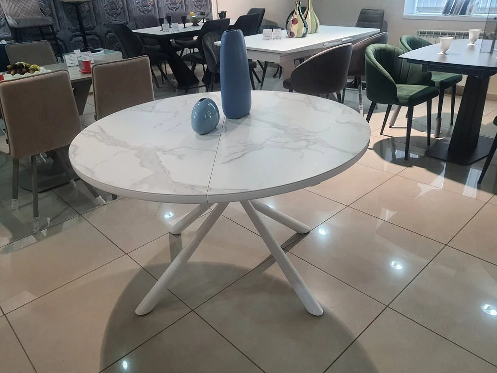 Каркас и ножки выполнены из металла, окрашенного в белый матовый цвет, что придает столу лёгкость, строгость и визуальную чистоту.